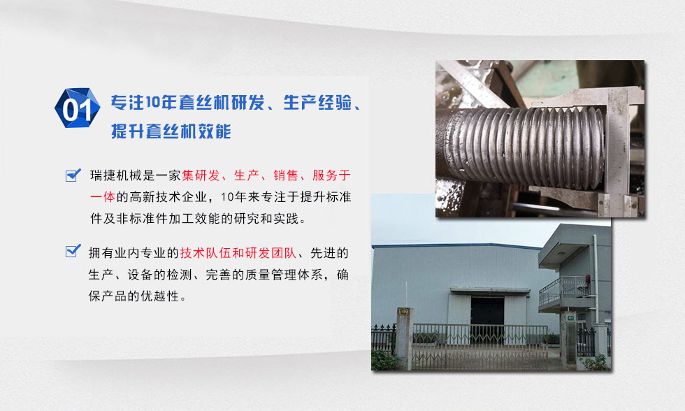 邢臺市瑞捷機械制造有限公司專業生產圓鋼套絲機,鋼管套絲機兩大系列,其特點主要展現為機頭的優化改進,大幅度提高了加工螺紋絲頭的精確度和工作效率,有效解決了本行業在加工絲扣上端部易扭轉變形(絲扣加易擴口)、配件損耗高、加工效率低的技術難題。